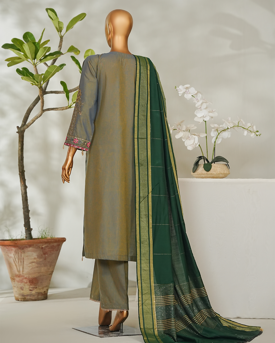 Two tone lawn Sequence Embroidered Front, Embroidered Sleeves, Back Plain, Patch for Daman & Sleeves, Banarsi Shwl Dupatta & Plain Trouser