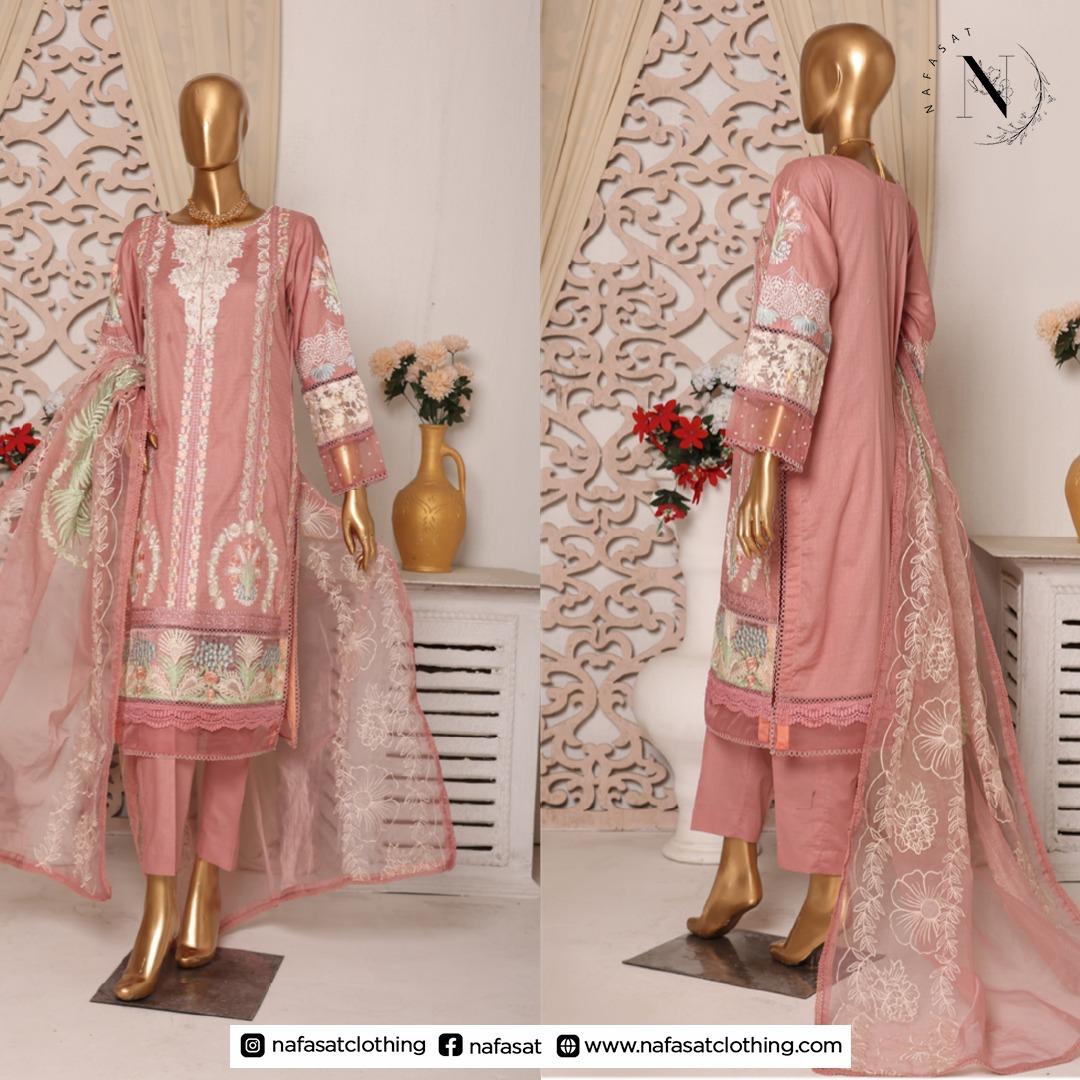 Cotton unstitch Embroidered front,embroidered border for daman Embroidered sleevesOrganza ready to wear Embroidered duppata Dyed cambric trouser