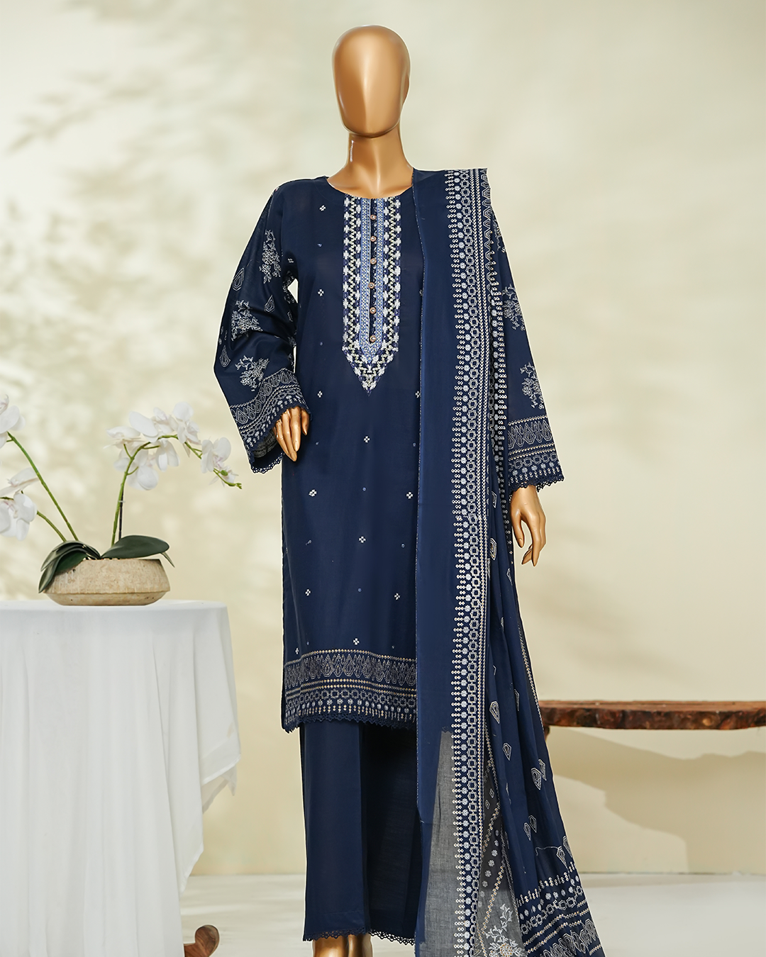 Details: Slub lawn block print Embroidered shirt,block print back and sleeves,Dyed cambric trouser,Block print lawn duppata